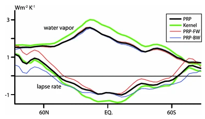 They all look similar, with the main negative part of the lapse rate feedback located in the tropical range of about -1.2W/m2, +/- something. I did some point for point analysis with the last graph and found that is would correspond to a total LRF of -0.62 which is on the higher end of current LRF estimates (typically in the -0.5 to -0.6 range). The one in the middle gives an even higher figure of above -0.8W/m2, consistent with the central AR4 estimate of -0.84.
