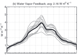 Tropical Water Vapor Feedback (WVF) on the other side is massive in the models. There is some difference between the inner- and the (dry) outer tropics. As in ZH11 it is up to 3.8 or 3.9 maximum in the inner tropics and about 3 in the outer tropics, with roughly +/-1 variability over the different model runs.