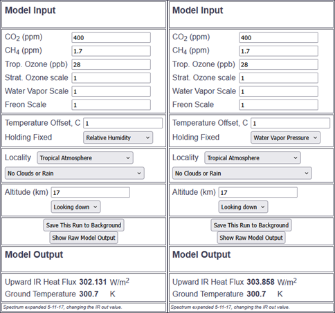 This is indeed an inner tropical scenario with about 51mm of precipitable water in the atmosphere. You can find that by checking out the “raw model output”. Then I am using a temperature offset of 1K and let modtran do the calculations according to the Clausius Clapeyron equation, which is more accurate than simply adding a certain percentage of WV, and yields a higher result (it would be 1.633 with a plain 7% increment). You can do that by switching between “Water Vapor Pressure” and “Relative Humidity”. Also I am using an altitude of only 17km so that we skip the whole stratosphere, which modtran would otherwise heat by equally 1K, making little sense in real life.