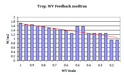 In the outer tropics, because of a lower WV concentration in the first place, clear sky WVF is smaller anyway, like about 1.3W/m2. But there is a little issue with modtran. If you just half the “water vapor scale”, thereby effectively tuning down relative humidity and approximating the dry outer tropics, you get 1.57W/m2, again without clouds. This figure is way too high and a glitch due to limited resolution.