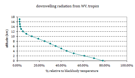 With a different perspective we can get more reason into this question. I checked modtran for “back radiation” at the respective altitudes with all other GH-agents removed. This will give us an idea how the tool is assessing the optical thickness of WV by altitude. It is no way perfect, as we are supposed to look down, not up, but it yet gives us some idea on how the weighting of WVF will be.