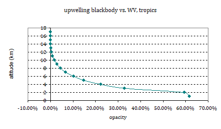 While it is still not perfect, it gives us a very good view on the optical thickness of WV by altitude as represented in the inner tropical scenario in modtran. To provide context, the S05 chart shows about 50% lapse rate effect at ~5.2km altitude, about 100% at ~7km and about 150% at ~10km. In other words, at those altitudes warming considerably more than the surface, thereby potentially holding accordingly more WV and producing more WVF, the optical thickness of WV runs so low, that it barely matters. I mean it does matter, but the impact is limited.