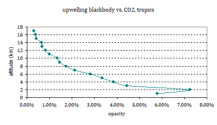 Think of it like this. If there was a slab layer at 10km altitude, like an optically thick cloud layer, modtran would not give us 343W/m2 in upwelling radiation (blue) there, but only 175W/m2. Going from 9 to 10km in altitude, upwelling radiation would need to drop by 171W/m2 if there was something perfectly opaque. The actual drop off in the model is just 3.14W/m2, and so we can relate these two figures (3.14/171= ~2%) to determine the relative opacity of the respective layer within the model. Et voila!
