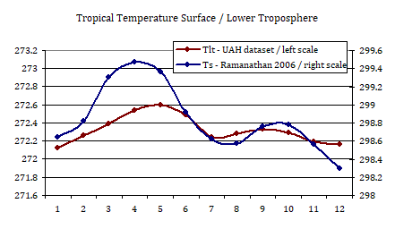 I took the data from said Ramanathan publication and matched it versus the UAH lower troposphere base. Both represent the annual temperature (variation) for tropical latitudes between 30°N and 30°S, thereby also representing 50% of the whole Earth. With the assumed negative LRF the variation in Tlt would need to be larger than that of Ts..