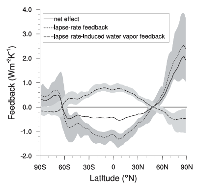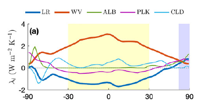 I found three illustrations of lapse rate feedback (LRF) online, as listed below. They are based on different models and they have different scales. One is north to south in the x-scale and has the poles inverted, while the one in the middle uses a surface area weighted scale (=sin(latitude)). Note that 50% of the Earths surface is in the tropical range between 30° latitude north and south respectively.