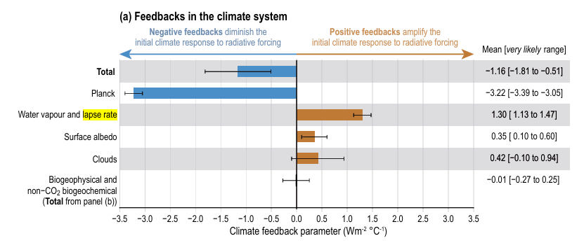 Since AR5 it has been clarified that by construction, the sum of the temperature lapse rate and specific humidity (LR + WV) feedbacks is equal to the sum of the Clausius Clapeyron feedback