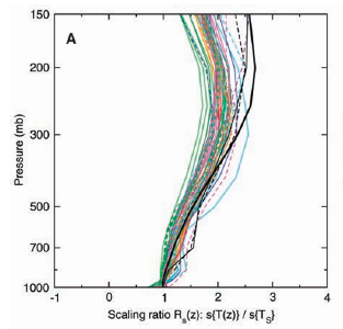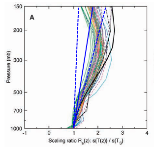 Now in the tropics the average emission altitude is somewhat higher, roughly over 6km altitude at a pressure level of around 450mbar. With these values we can infer an increment of Tz at least 1.67times (=3/1.8) larger than that of Ts, though in that specific model it might even be 2times, like 3.2/1.6.
