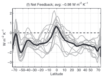 If you look at fig.3 in ZH11 the tropical feedbacks are like known -4.85 temperature feedback, approx +1 cloud feedback and let us say +3.2 WV feedback, while albedo feedback is basically a flat zero in the tropics. If we sum this up we get about -0.65 for total feedbacks, roughly consistent with the sum of all feedbacks as in the chart below.